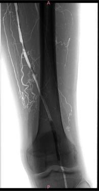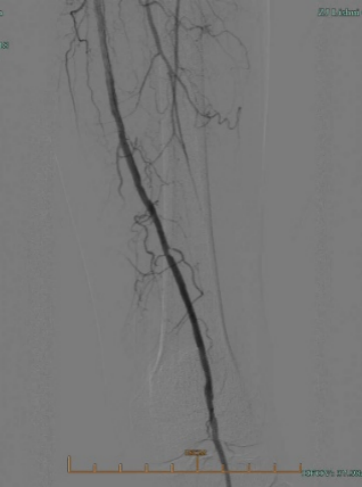 右侧股动脉翻山入路,经鞘管造影显示下肢动脉多发硬化改变。