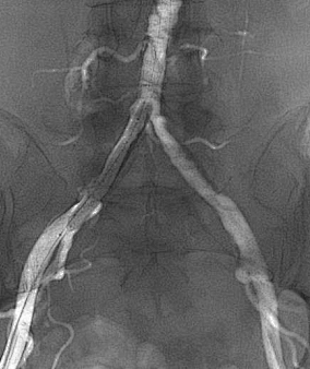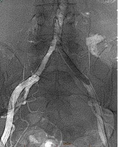 经腹主动脉造影如术中所见双侧髂动脉中-重度狭窄。