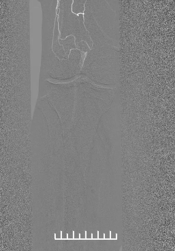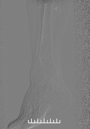 3.药涂球囊:导入5mm*150mmLUTONIX 035紫杉醇药物涂层球囊扩张病变段股浅动脉(图7)。最后采用2mm*200mm球囊扩张腓动脉,确保良好流出道。扩张后再次经鞘管造影见右股浅动脉管腔恢复,右股动脉、腘动脉及膝下动脉流速可(图8,9)。