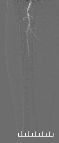 1.右股浅动脉中下段局限重度狭窄,接近闭塞,右下肢膝下腓动脉单一流出道。已出现静息痛,右下肢ABI 0.35,有手术指针。