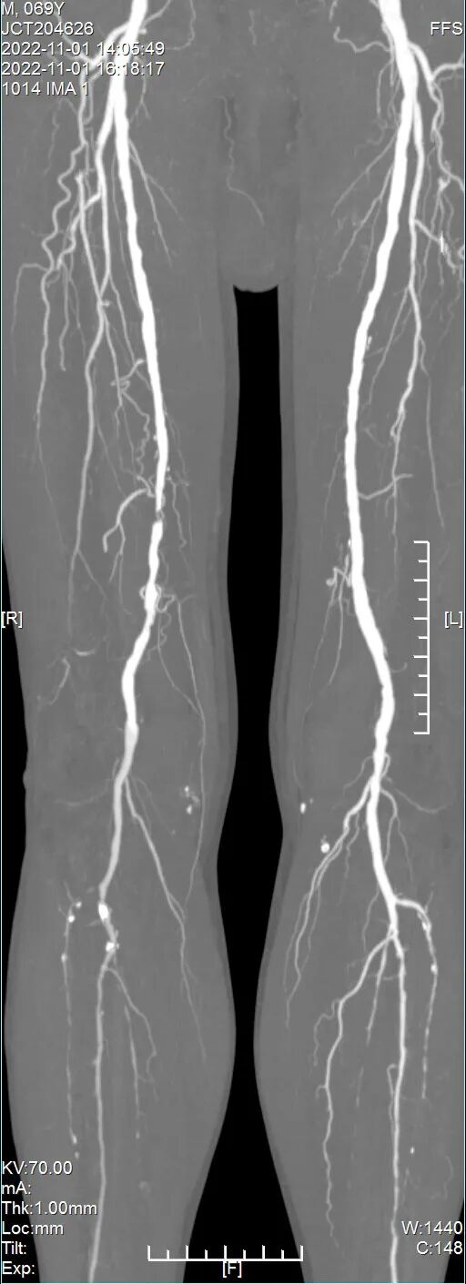 CTA:腹主动脉及双下肢动脉动脉粥样硬化改变,右股动脉中下段、胫后动脉起始段局部管腔重度狭窄。余管腔多发轻-中度狭窄(图1)。