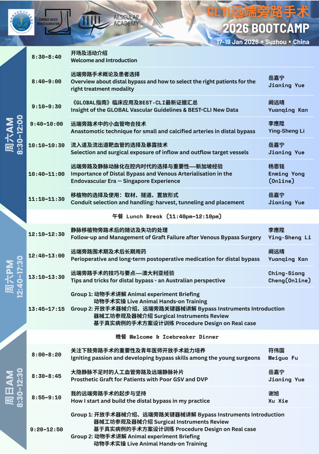 2026年1月17–18日,由海峡两岸医药卫生交流协会血管外科分会发起,复旦大学附属中山医院血管外科团队策划的CLTI远端旁路手术Bootcamp在苏州蛇牌学院(Aesculap Academy)顺利举行。本次学习班为期1.5天,以“循证理念引领、系统理论夯实、真实操作训练”为核心,聚焦慢性肢体威胁性缺血(CLTI)这一当前血管外科最具挑战性的临床领域。
