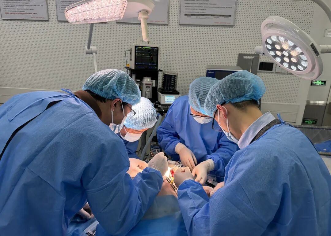 在标准化动物手术室中,学员在活体猪模型的颈动脉上完成自体静脉旁路手术的真实体验: