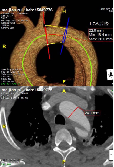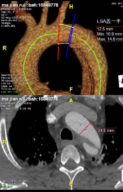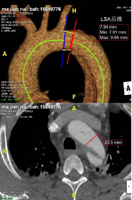 患者很年轻,不希望支架开窗或干扰左锁骨下动脉,但破口紧邻左锁骨下动脉小弯侧(小弯侧破口距锁骨下动脉只有7mm,大弯侧9mm),挑战比较大。需要评估是否延长近端锚定区以覆盖病变,同时避免影响重要分支血供。