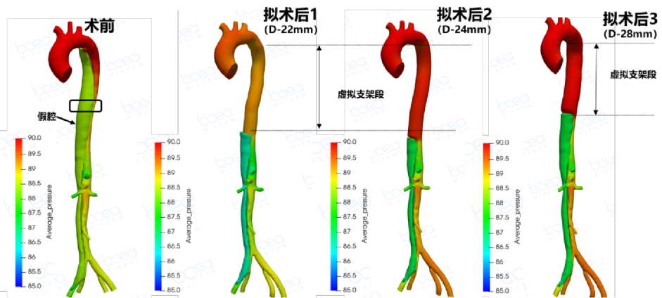 ③ 支架选择策略:通过术前规划模拟不同口径、长度支架的植入效果,预测术后真腔重塑及对血流动力学(如压力梯度、远端供血)的影响,最终选择适配血管直径及病变范围的支架。