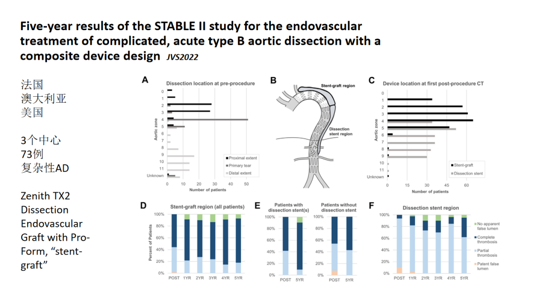 STABLE II研究:涉及法国、澳大利亚和美国的3个中心,73例复杂性AD患者使用Zenith TX2 Dissection Endovascular Graft with Pro-Form进行治疗。