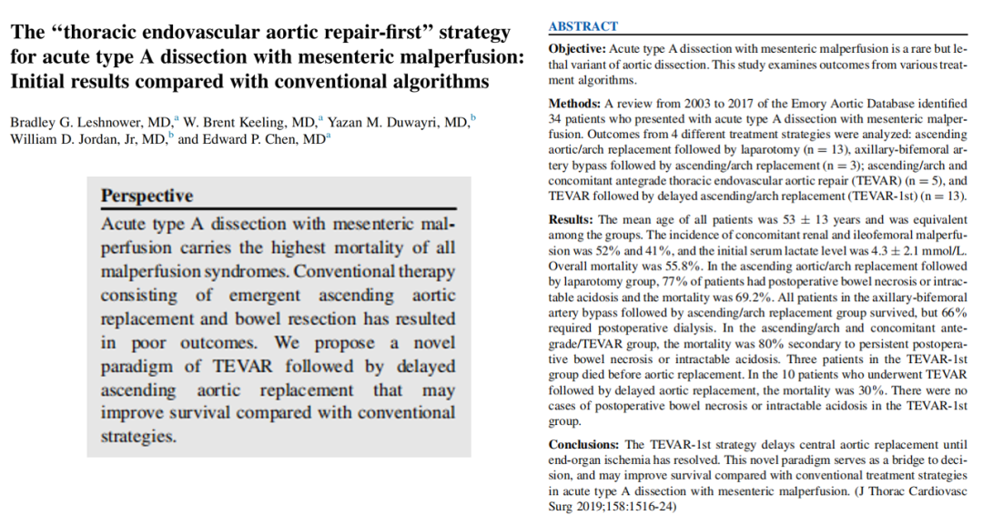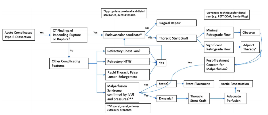 外科干预:包括开放手术和TEVAR。IRAD研究表明复杂AD死亡率TEVAR的死亡率为10.6%,开放手术为33.9%。FDA推荐TEVAR首选;ACC/AHA给予TEVAR 1级推荐。