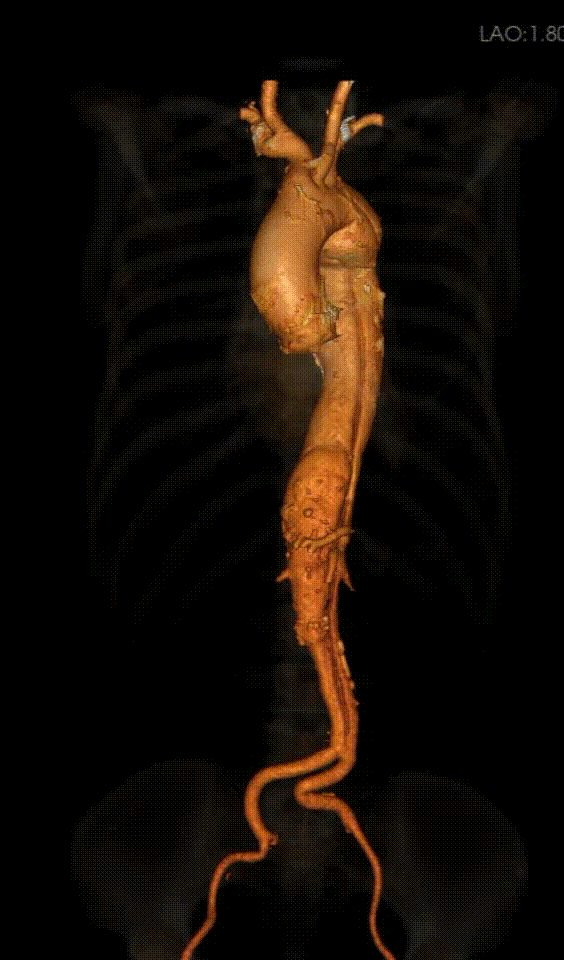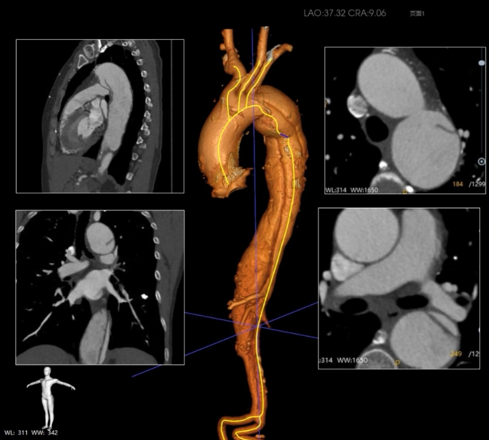 患者为 72 岁女性,因 “发作胸痛三天” 急诊入院。CTA检查结果显示为陈旧性主动脉夹层。夹层向前逆撕累及弓部,范围从左侧锁骨下动脉开口后缘远端延伸至腹主动脉分叉上方。分支血管受累:腹腔干、肠系膜上动脉及左肾动脉由真腔供血,右侧肾动脉由假腔供血。