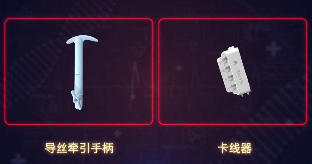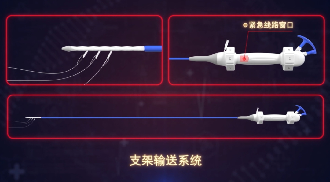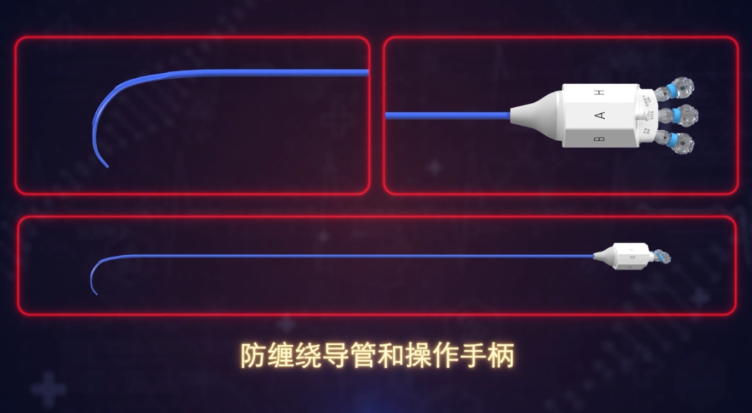 将主导丝与导管准确卡入对应分线器卡槽内,撤出防缠绕导管内的导引导丝,各分支导管分别接入对应的分支导丝。主导丝连接支架输送系统,各牵引导丝从弓上引出并连接牵引器,通过牵引器保持适当张力,确保支架手柄编号与防缠绕导管手柄编号一致。