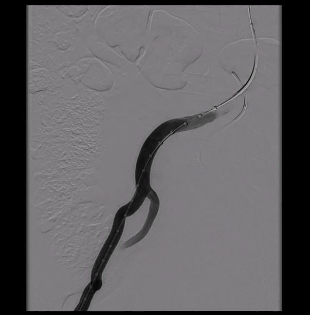 双侧入路扭曲纤细,最细处右侧髂外直径6.5mm,左侧6mm;降主及腹主真腔严重受压,管腔狭窄。