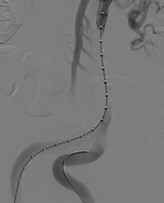 从右侧股动脉入路,使用超滑导丝进入真腔,置入金标猪尾导管造影,再次造影明确夹层真腔位置、形态,可见腹主动脉及降主动脉真腔处多处严重狭窄受压,假腔呈瘤样扩张并累及左侧锁骨下动脉。