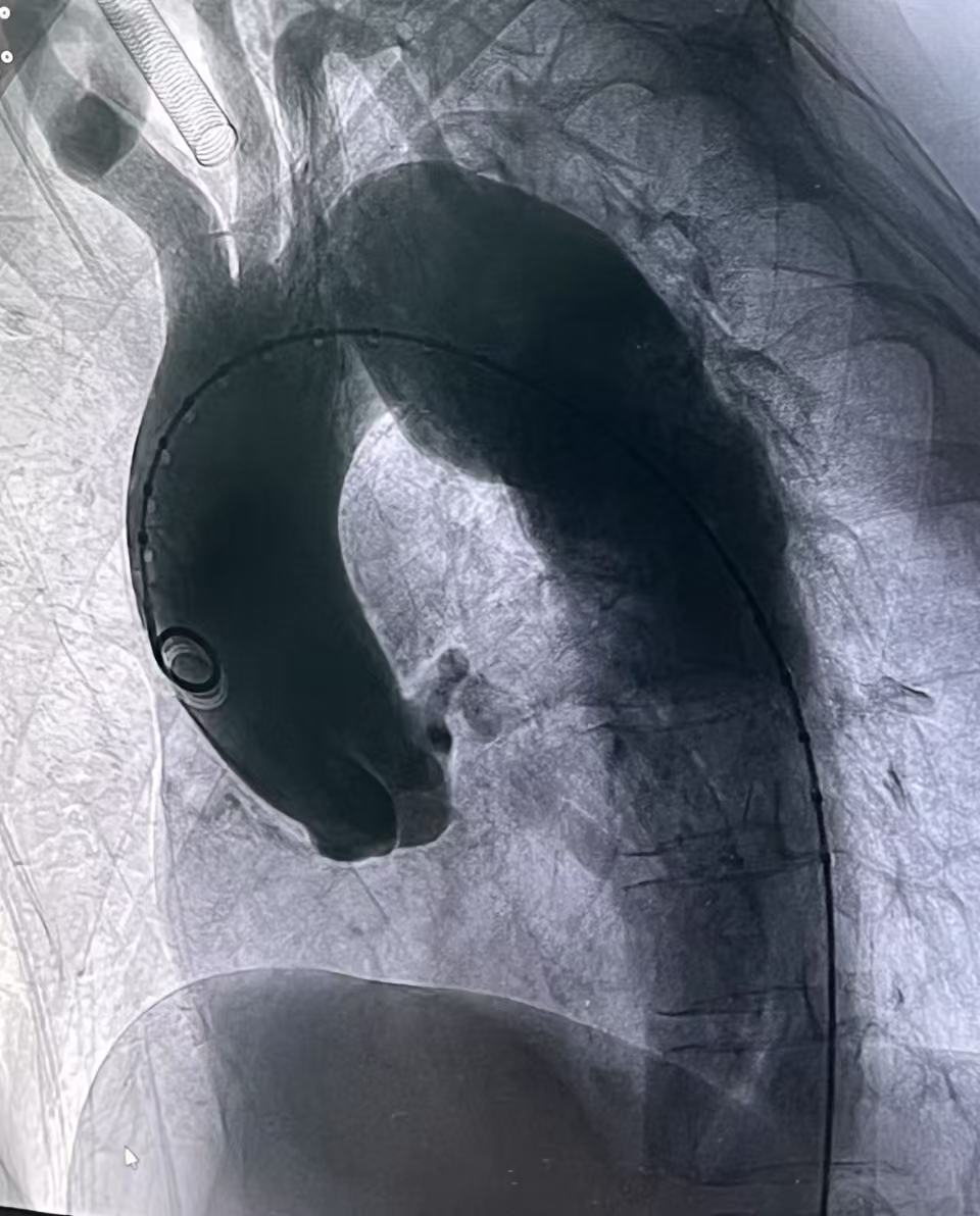 同时,考虑到患者拒绝开胸手术,为在保证治疗效果的前提下最大程度降低手术创伤,医疗团队综合评估后,决定采用FixTa一体化三分支型主动脉覆膜支架行胸主动脉覆膜支架腔内隔绝术+无名动脉、左颈总动脉、左锁骨下动脉分支重建术。该方案旨在通过腔内介入技术,精准修复主动脉夹层,恢复主动脉正常血流,同时减少手术创伤及并发症风险。