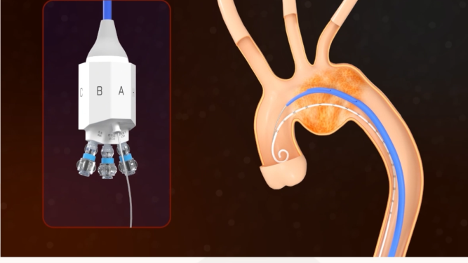 本次一体化三分支主动脉覆膜支架腔内治疗陈旧性主动脉夹层手术的成功实施,展示了复杂主动脉夹层腔内治疗的前沿技术,为累及弓部主动脉病变治疗提供了重要的实践依据和参考经验。该支架突破传统腔内治疗对弓部分支解剖的限制,结合防缠绕导管的精巧设计和导丝牵引技术,使手术操作更加精准简便省时,同时避免了开胸手术的创伤,缩短术后恢复时间,为今后治疗类似复杂病例提供了一种治疗选择。