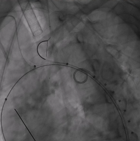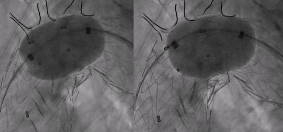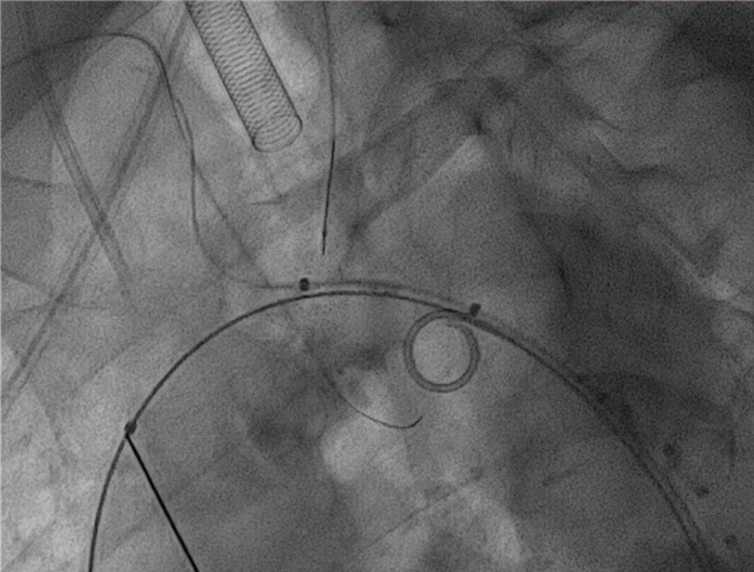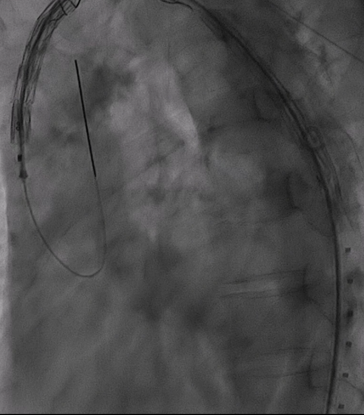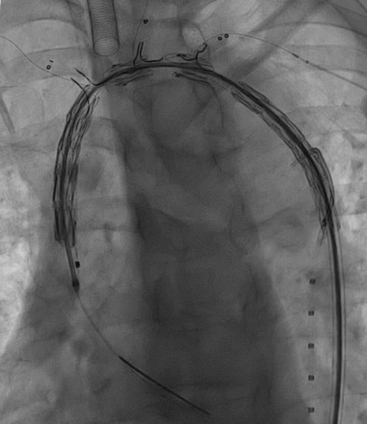 通过左侧股动脉入路置入猪尾导管,并在超硬导丝引导下置换24F大鞘,缓慢送入防缠绕导管至主动脉弓部。