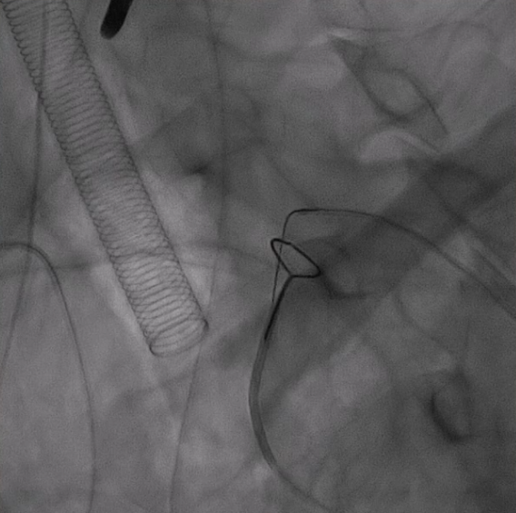 沿超硬导丝将主体缓慢送入主动脉弓部,透视下确保导丝无缠绕。