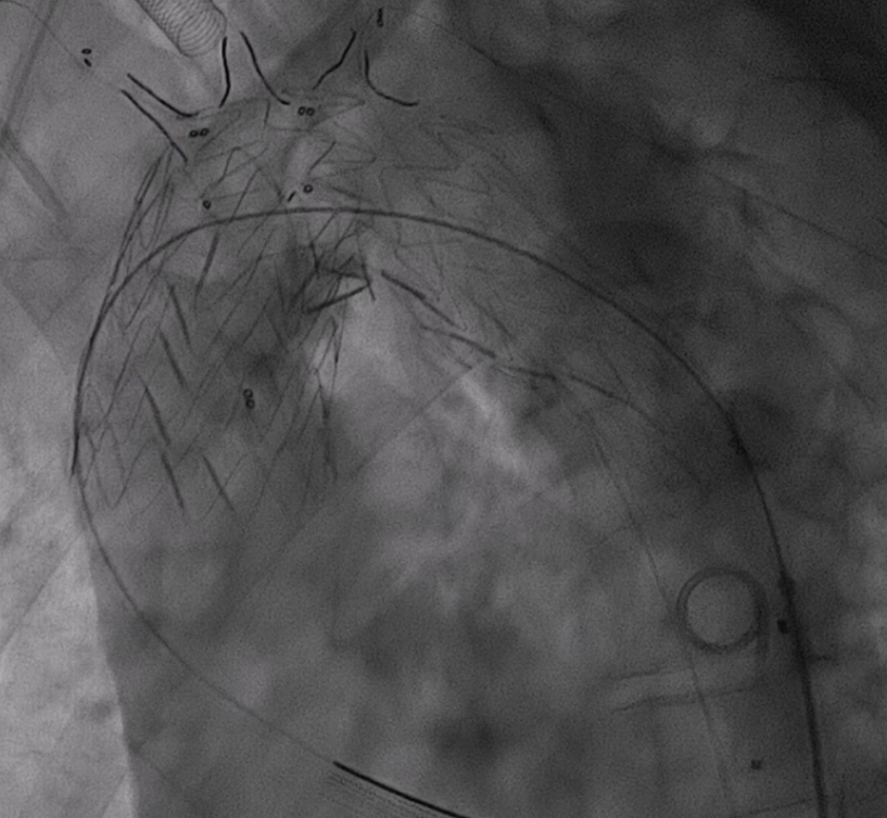 调整支架位置,确保主体分支支架对应无名动脉、左颈总动脉及左锁骨下动脉开口位置满意。