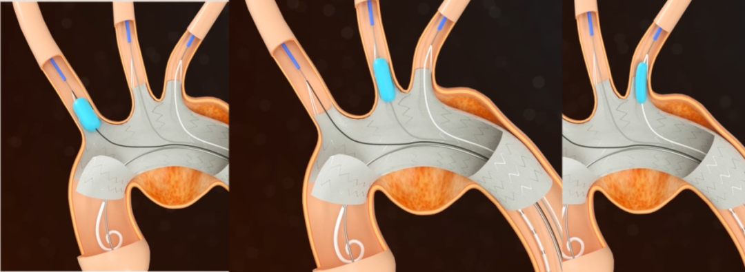 于无名动脉、左颈总动脉及左锁骨下动脉开口位置处释放裸支架,维持血流通畅。