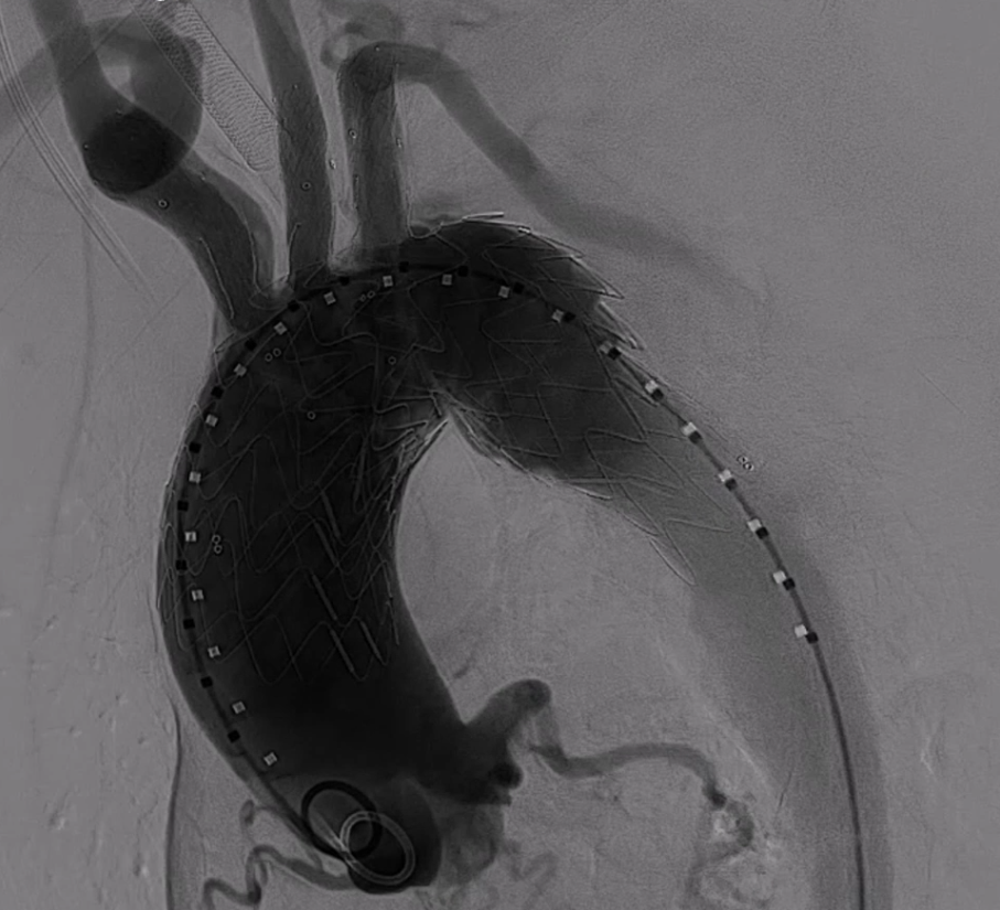术后造影显示,主动脉支架定位精准,三分支支架内血流通畅,夹层内仅有少量膜渗情况。从手术即刻效果来看,该治疗方案达到了预期目标,有效修复了主动脉夹层,恢复了血管的正常解剖结构和血流动力学状态。