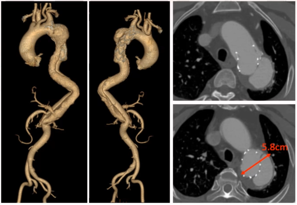 患者为66岁男性,13年前因Stanford B 型夹层接受 TEVAR 手术治疗。2月前CTA复查发现原支架近端内漏,夹层主动脉瘤形成,伴间断胸闷,无胸痛、声嘶等症,无腹痛。该患者有高血压、陈旧性脑梗病史。