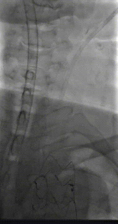远端造影可见内脏动脉区存在破口,且有逆向造影剂流动。本次手术暂未处理,后续将进一步探讨治疗方案。