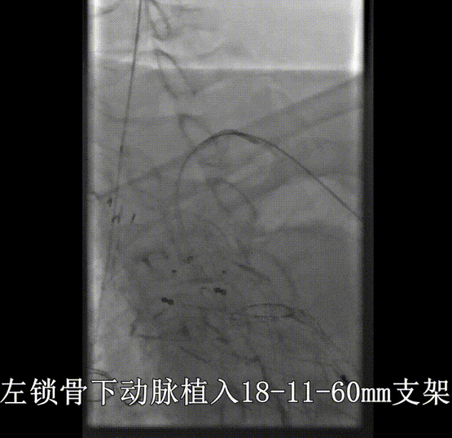 通过内嵌逆向分支进入左锁骨下动脉,利用导丝牵张技术建立轨道,经股动脉植入左锁骨下动脉分支支架18-11-60mm(输送器 12F)。