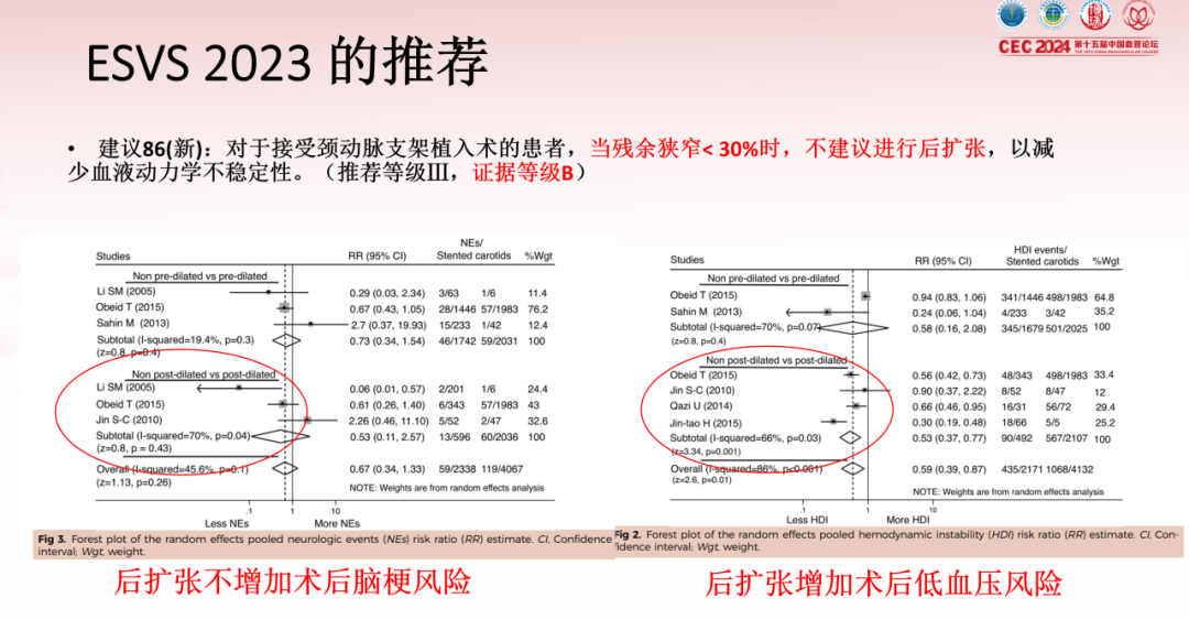 ESVS2023指出,后扩张不增加术后脑梗风险,但会增加术后低血压风险,建议残余狭窄<30%时避免常规后扩张,以减少血液动力学不稳定性(推荐等级III,证据等级B)。