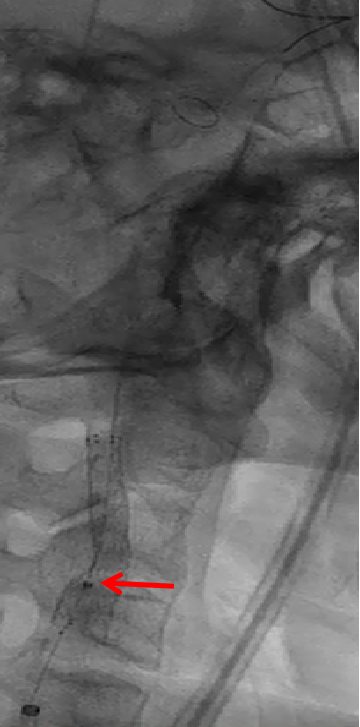 放完支架后形态和血流通畅,但在做保护伞回收过程中,回收鞘上不去了,表明球囊后扩张可能会取得更好的效果。