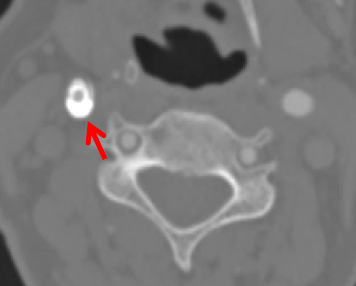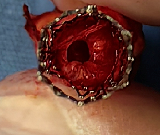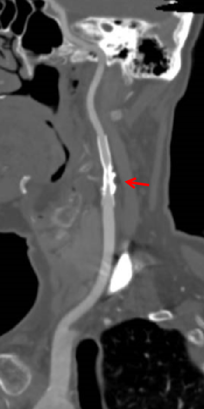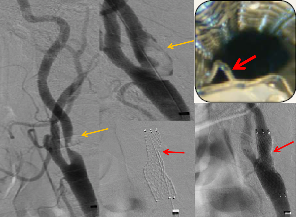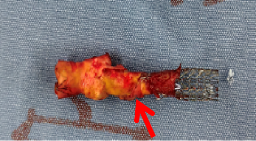 这是一个取支架的病例,支架内再狭窄,支架膨胀不全。贴近颈内动脉远端的支架里很光滑,从最后一幅图看,最狭窄处内膜增生严重。这是因为局部涡流形成,导致支架内再狭窄。