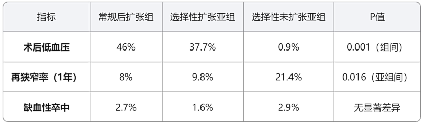 选择性未扩张亚组再狭窄率显著更高(21.4% vs. 9.8%),提示后扩张可降低再狭窄风险。