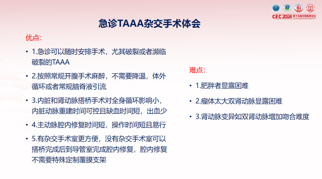 尽管开刀手术仍是复杂TAAA的主流方式,但杂交手术展现出其有效性以及特有的优势。尤其适于急诊患者。