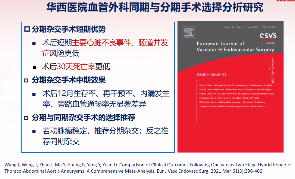 华西医院 2021年报道了杂交手术行同期与分期的结果对比。结论:如动脉瘤稳定,推荐分期杂交,反之则推荐同期杂交。