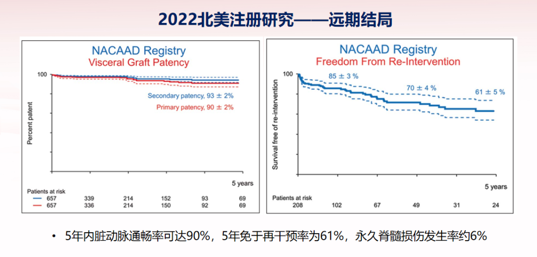 2022北美复杂胸腹主动脉瘤去分支技术(NACAAD)注册研究:共208例患者,5年生存率以及免于再干预率均为61%,5年内脏动脉通畅率达90%。据此得出结论:在有经验的杂交手术中心,一般情况良好的TAAA患者行杂交手术的效果可比拟,甚至优于开刀或腔内手术