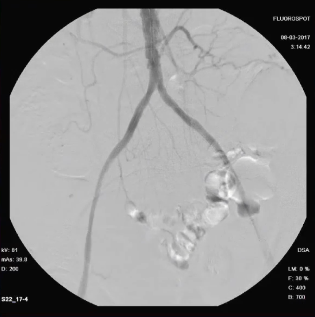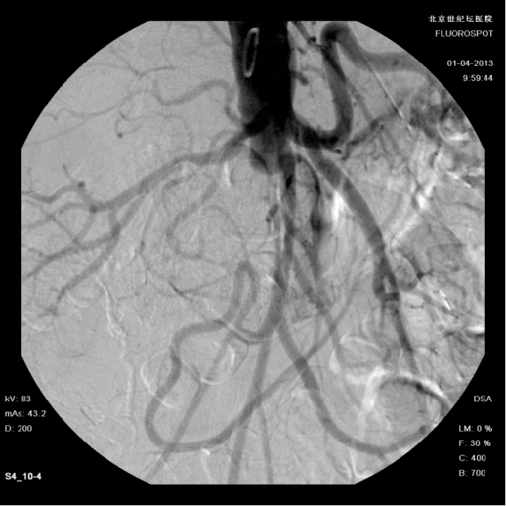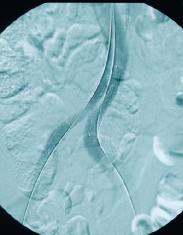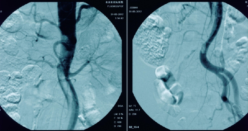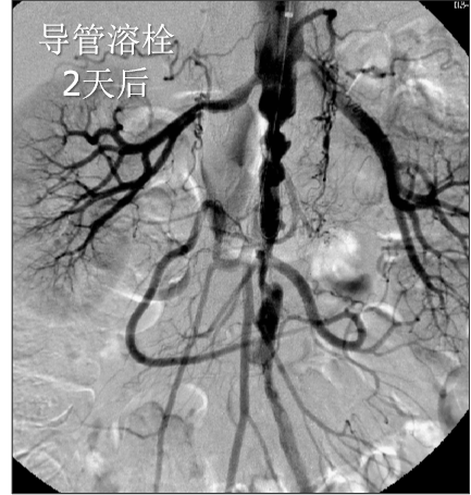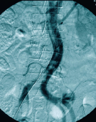 造影提示患者为长段闭塞,如果一期行腔内治疗,则累及肾动脉;所以行预置导管溶栓,后行支架术,血流重建效果显著。