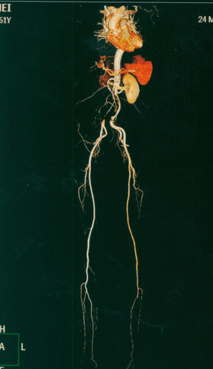 男性、58岁,间跛100米、慢性下肢缺血,病史3年