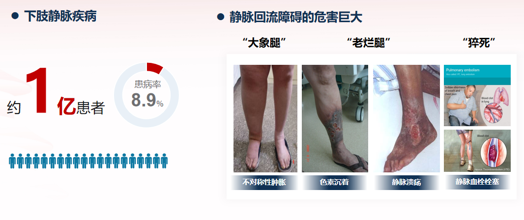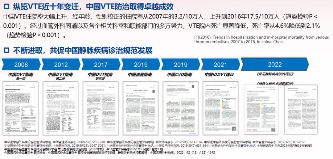 中国约1亿患者受下肢静脉疾病困扰,VTE(静脉血栓栓塞症)住院率从2007年3.2/10万上升至2016年17.5/10万,但院内死亡率显著下降(4.6%→2.1%)。