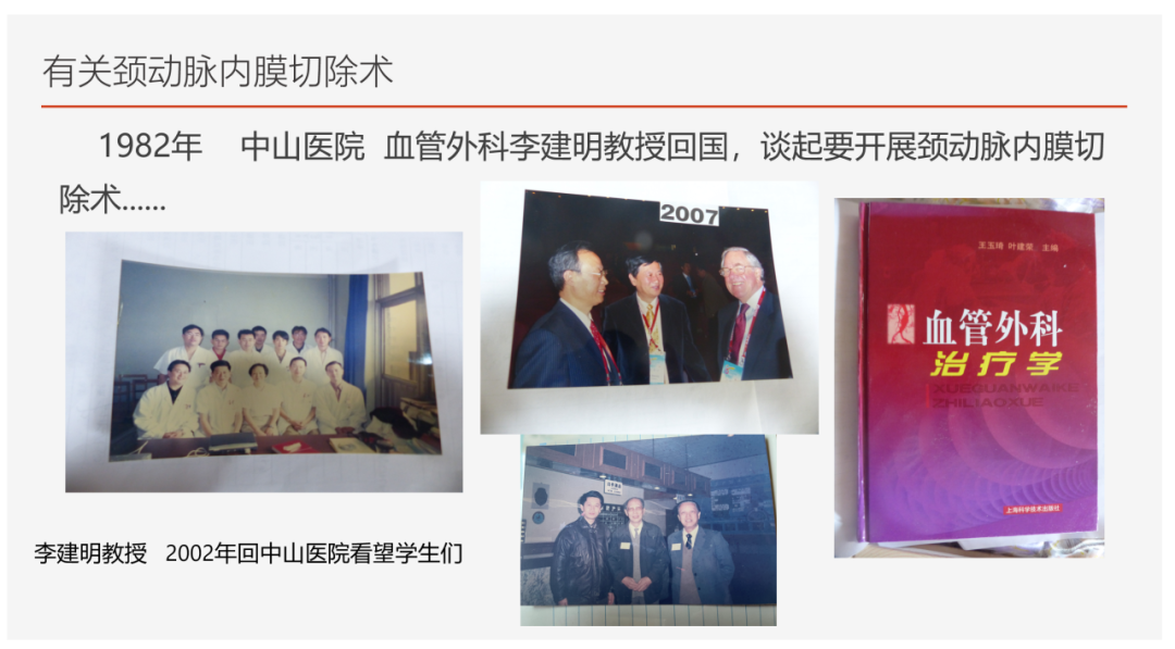 李建明教授的努力:李建明教授在80年代初期从美国回国后,致力于在中国开展颈动脉内膜切除术,但由于当时检查设备条件较差和病人观念未转变,虽然做了很多工作,但没有取得成功。