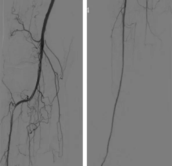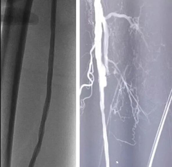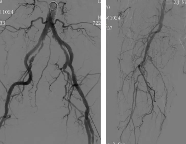 1、左股动穿刺置入猪尾导管造影双髂动脉及右下肢动脉,造影见右股浅动脉长段闭塞,腘动脉显影尚可,膝下胫前动脉显影,胫后及腓动脉未显影。