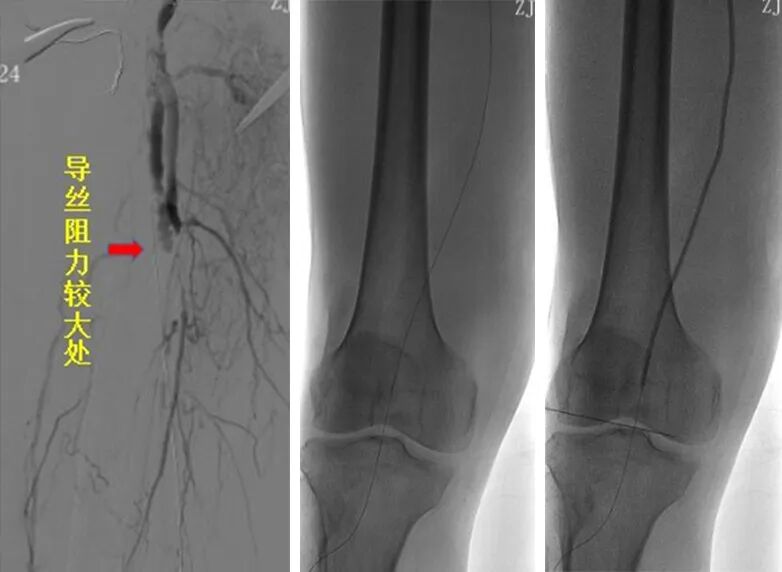 2、交换6F翻山鞘后,单弯导管配合导丝拟开通右股浅动脉病变,术中开通右股浅动脉近端时阻力较大,单弯导管配合泥鳅导丝下行距分叉5cm左右处下行困难,遂交换0.035系统支撑导管成袢下行通过。