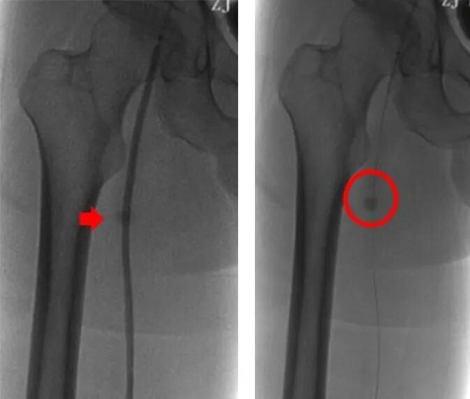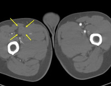 医疗组再次调阅术前CTA影像横断面:右股浅近端此区域存在血管扩张样改变(见下图)