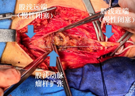 5、0.1%利多卡因局麻下切开股浅动脉近端病变,探查见股浅动脉病变类型为慢性动脉硬化闭塞合并血栓形成,同时可见局限性股浅动脉瘤样扩张。