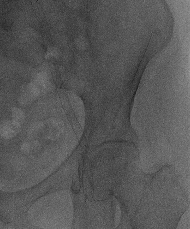 造影显示右侧髂外动脉、股动脉血栓栓塞。