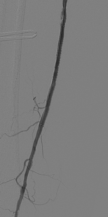 顺行穿刺无法开通,行左侧腘动脉逆行穿刺,超选进入顺行导管。