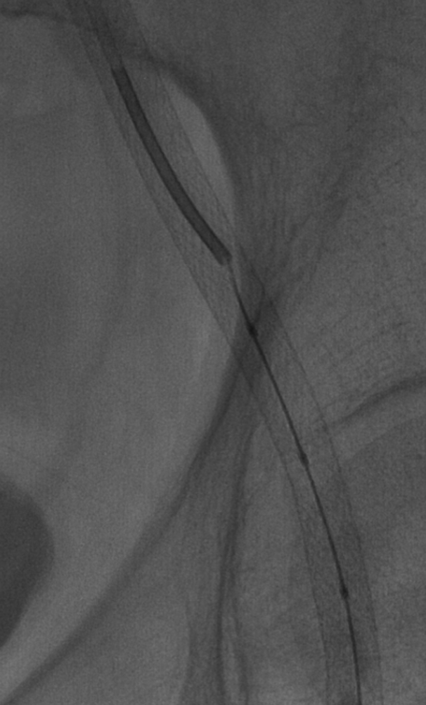 球囊扩张全程血管,显示支架内有陈旧性血栓,予6F导管吸栓,最后造影显示血流较前通畅,部分附壁血栓继续抗凝治疗,定期随诊。予Exoseal封堵穿刺点。