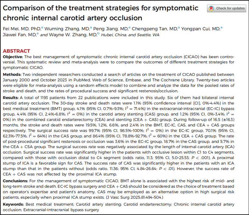 在血管外科的临床决策中,颈动脉慢性完全闭塞(CCAO)的诊疗一直存在着明显的二元对立:症状性患者积极干预,无症状患者保守治疗。