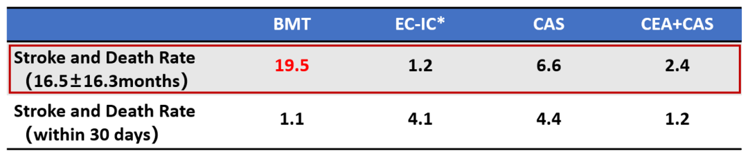 症状性患者: 争议较小。多项研究(包括团队发表的Meta分析)显示,对于症状性患者,无论是EC-IC搭桥、CAS还是复合手术,其开通手术的中长期获益均优于单纯药物治疗(BMT)。药物治疗组在中远期随访中(>1年)的卒中和死亡率接近20%。