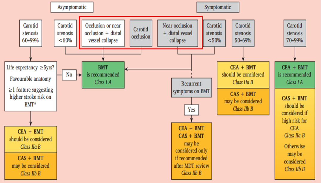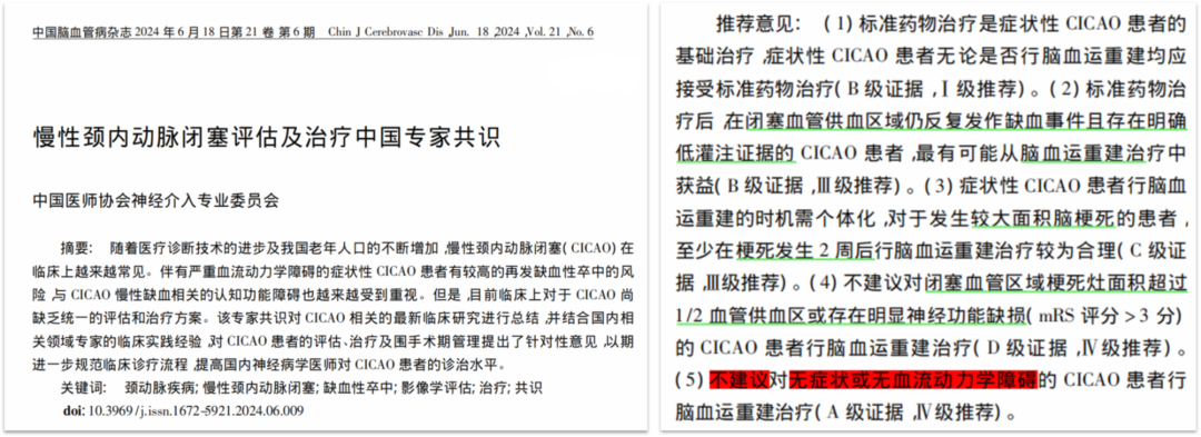 无症状患者:国内外指南(如ESVS、SVS及中国专家共识)对于无症状性CCAO的推荐意见高度一致:不建议进行手术或腔内干预,仅推荐最佳药物治疗(BMT)。然而,这一推荐意见的等级往往较低(通常为III级推荐,C级证据),其理论基础主要基于“专家共识”而非高等级RCT研究。更关键的是,现有指南的临床终点过度聚焦于“缺血性卒中”的预防。