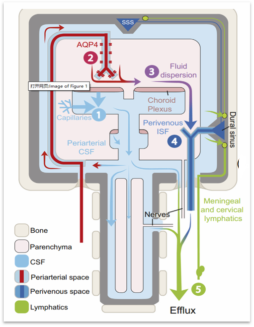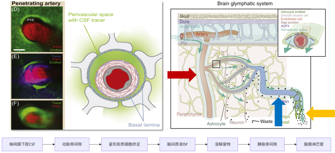 工作原理: 脑脊液(CSF)顺着动脉周围的血管旁间隙(PVS)流入脑实质,与组织间液(ISF)混合,带走代谢废物(如Tau和β-淀粉样蛋白),最后沿静脉周围间隙排出。