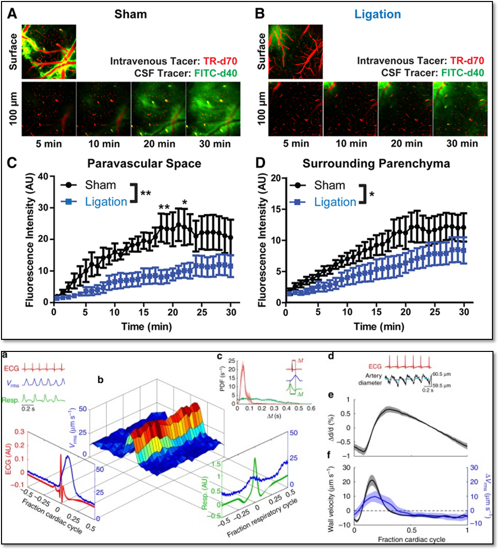 图:减弱动脉搏动可以减缓脑脊液示踪剂进入和通过大脑皮层的速度;脑脊液的流速是与心动周期相关的脉冲信号,与动脉搏动速度相匹配,当血压升高和动脉搏动减弱时,PVS中的反流也会增加