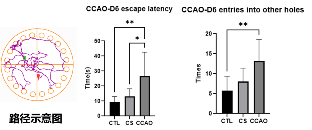 现象: CCAO组小鼠在受到刺激后,找到逃生孔的潜伏期显著延长,且频繁探错孔。
