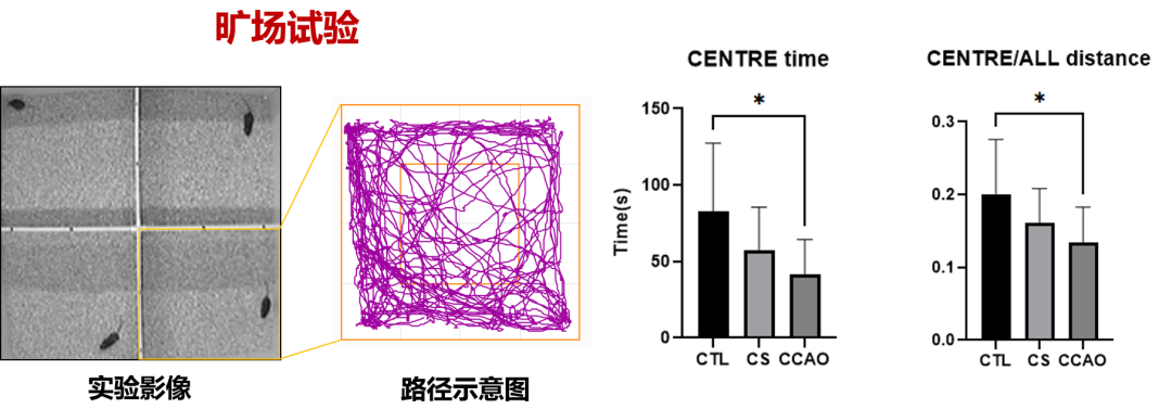现象: 正常小鼠喜欢探索开阔场地的中心区域(好奇心),而CCAO组小鼠表现出明显的“贴壁行为”(Thigmotaxis),倾向于待在阴暗的角落。